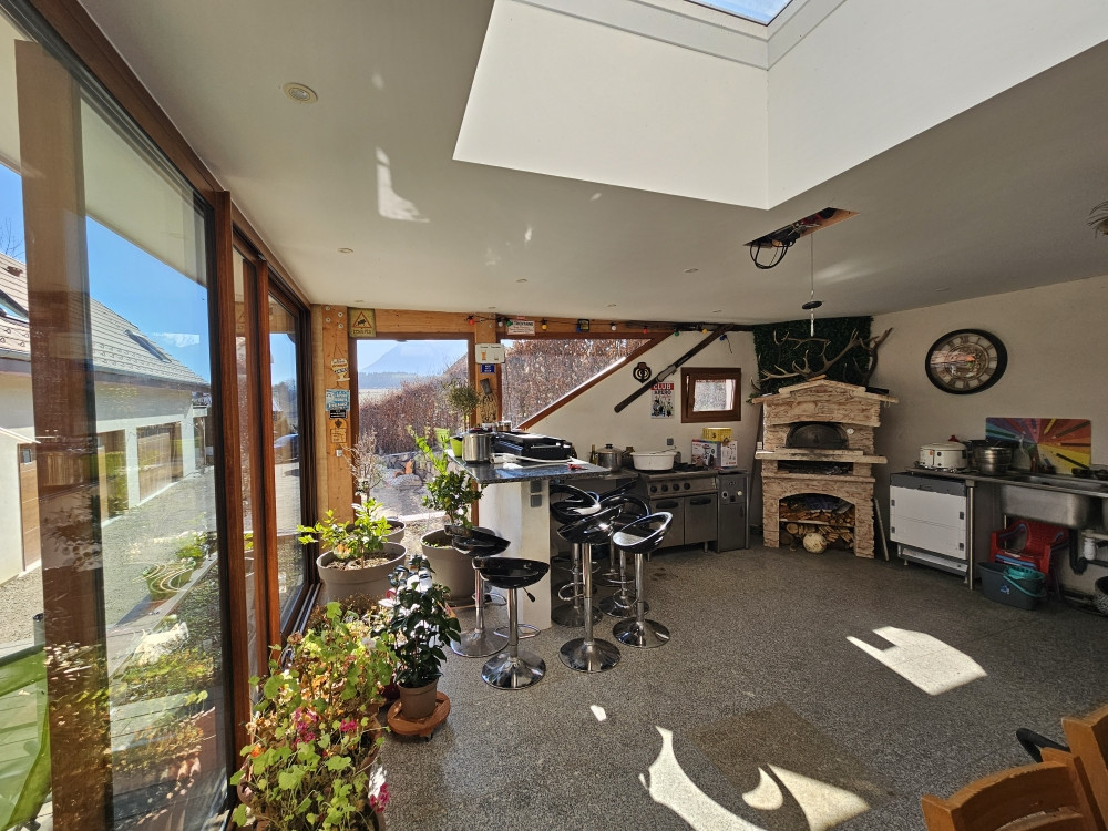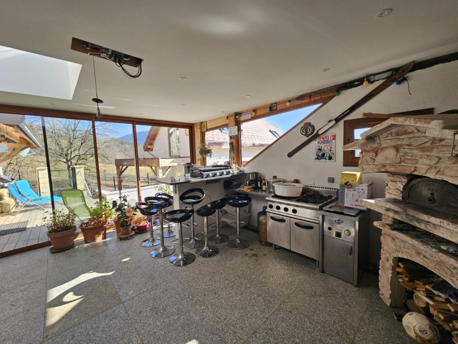 Composé au rdc d'une véranda sas d'entrée avec cellier, belle pièce de vie ouverte sur cuisine, un 2nd cellier, des toilettes et une véranda cuisine d'été avec four à pizza.