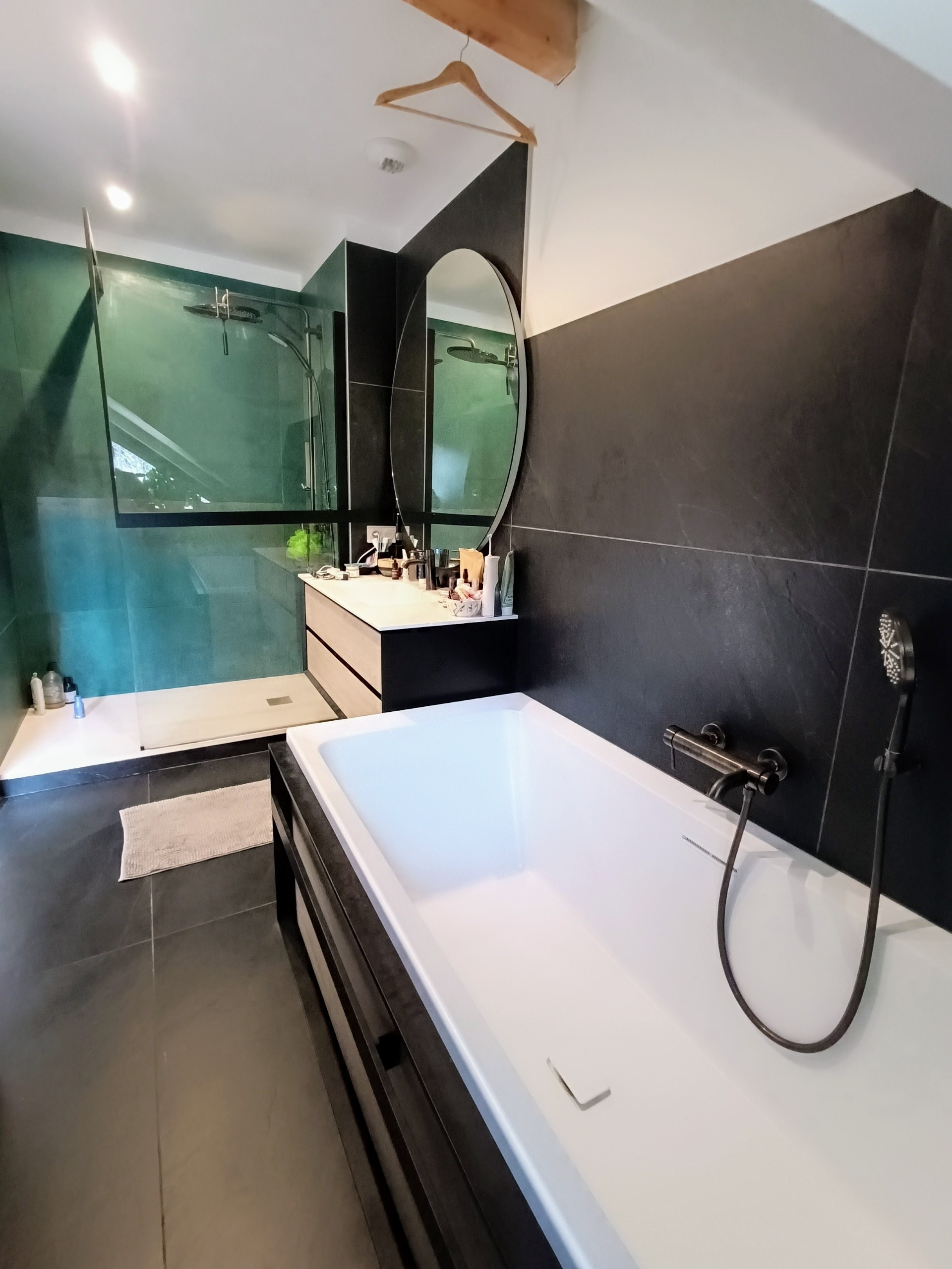 Le grand jardin accueille un espace bain Norvégien très apprécié ,un cabanon permettant de ranger le mobilier extérieur et des espaces de stationnements importants .