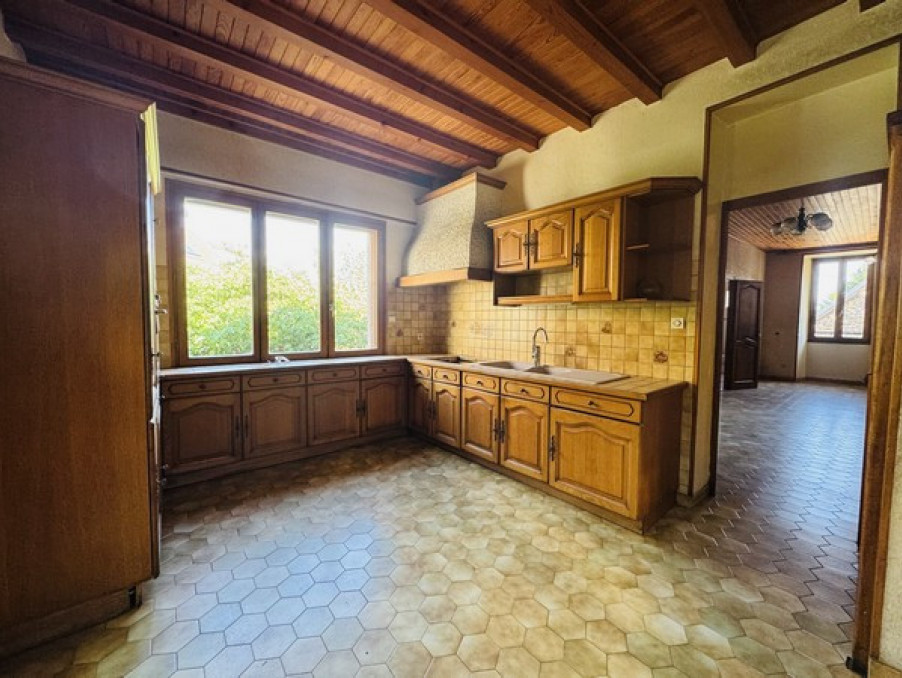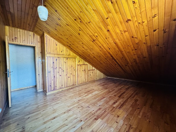 Cette maison dispose au rez-de-chaussée : une cuisine équipée, un séjour de 32m² et une salle d'eau avec toilette. A l'étage deux belles chambres et un wc. Le tout avec un garage de 27m² et une cave de 7m².