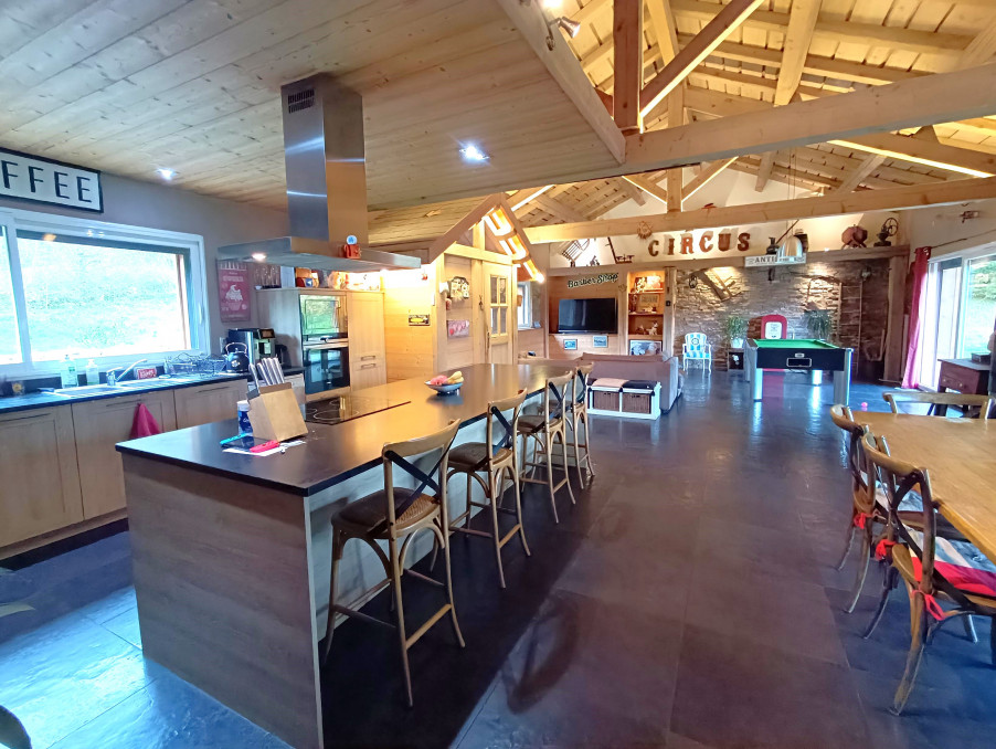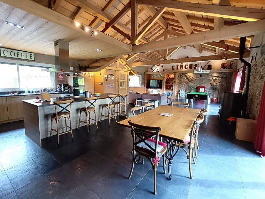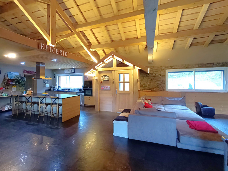 La maison se compose d'une spacieuse entrée pleine de charme avec sa forme de chalet, d'une magnifique pièce de vie de plus de 82 m2 avec charpente traditionnelle apparente, cuisine (Schmidt) ouverte toute équipée, cellier buanderie attenant, espace salon avec poêle à granulés. Le tout donnant sur le jardin plat exposé Sud.