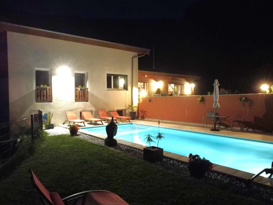 Vous pourrez profiter d'une belle piscine de 10x4m avec margelle en Travertin, liner armé, pataugeoire et vue sur les montagnes, d'un grand jardin au calme, d' un local technique de 16m2 et d'un espace de stationnement entièrement goudronné.